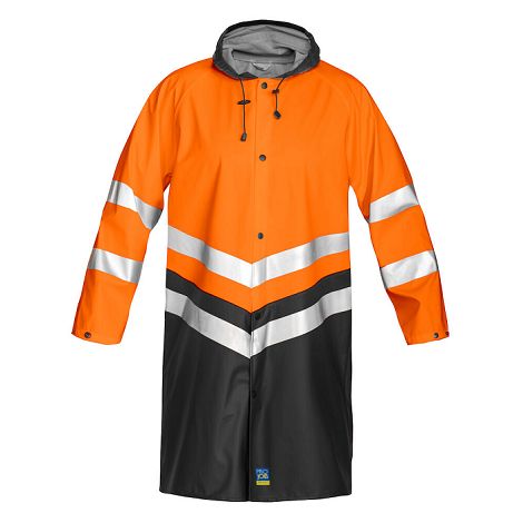 Veste de pluie - Coutures thermo-soudées - Imperméabilité : 3000 gr/m2/24h - Longueur 100 cm - Capuche + poignets ajustables - EN ISO 20471 Classe 3