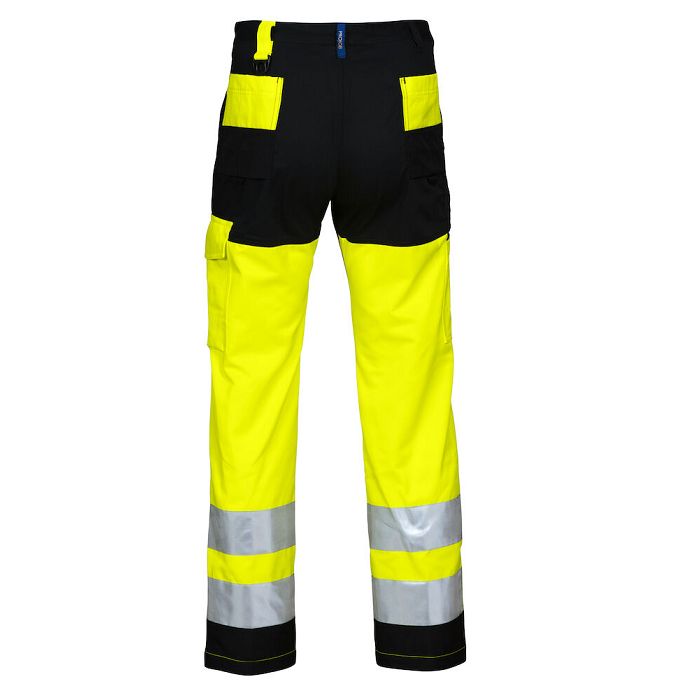 Pantalon polycoton HV - Poches Italiennes+ Zippée à droite - Poche jambe gauche sous rabat a/ poche téléphone + patte attache - Poche jambe droite multi-outils 5 compartiments + attache - Empiècement d'aisance entrejambe pour plus de confort et de résistance - Nombreuses poches multifonctions dont certaines zippées - D-ring à l'avant pour fixation badge identification - Renforts CORDURA® à l'Intérieur des poches + bas de pantalon pour une durabilité accrue -Compartiments genouillères intérieur -Zip YKK - EN ISO 20471 Classe 2 - Certification Oekotex 100 - lavage 60°