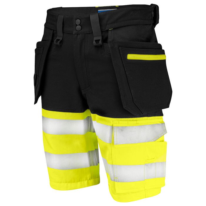 Shorts stretch - liberté de mouvement maximale - Stretch 4 directions sur les cuisses et le haut du short - Les côtés en haut ne sont pas en stretch pour donner de la stabilité au short - Poches flottantes décousables avec compartiments supplémentaires + renforcement interne en Cordura® - Poches spacieuses sur les jambes des deux côtés - Poche sur la jambe gauche pour outils et stylos, + poche pour téléphone avec fermeture magnétique + support pour fixer la carte d'identité - Sur le côté droit : poche pour règle pliante + poche pour outils avec un bouton de couteau - Possibilité d'ajouter du matériel complémentaire par Velcro - Poches flottantes + cuisses renforcées en Cordura® pour une durabilité accrue - Bandes réfléchissantes de 3M - EN ISO 20471 - CLASSE 1.