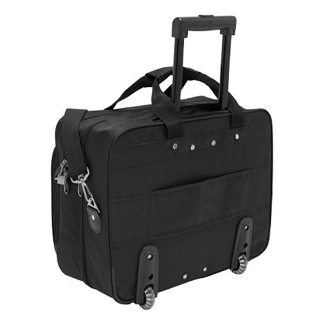 Attaché-case MANAGER à roulettes : poche frontale à fermeture éclair avec Plaque métallique pour logo, compartiment fermable rembourré pour ordinateur portable, 2 compartiments à fermeture éclair, systeme téléscopique avec roues transparentes, poignée renforcée et bandoulière détachable