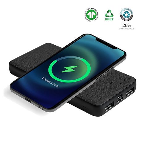 En associant le chanvre organique certifié GOTS et le plastique RPET issu de la récupération des bouteilles en plastique, cette batterie de secours induction 8000mAh joue clairement la carte de la fabrication recyclée.