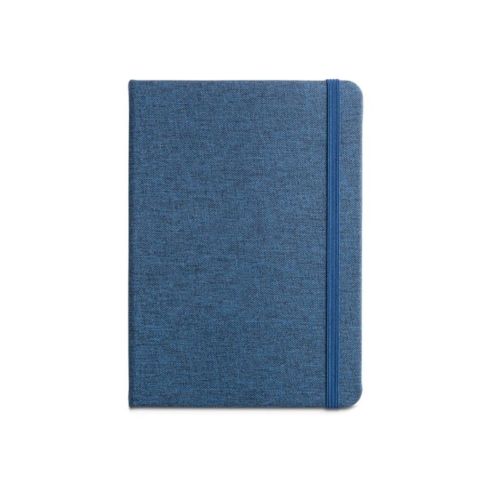Bloc-note A5 à couverture rigide en rPET. Avec 192 pages lignées papier ivoire provenant de la gestion forestière durable, ruban marque-pages, élastique et poche à l'arrière140 x 210 mm