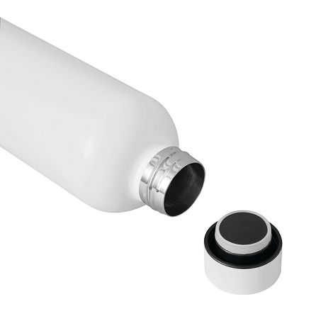Bouteille sous vide GET WARM, double paroi : intérieur et extérieur en acier inoxydable, couvercle en plastique de couleur assortie avec bouchon à visser et bague d’étanchéité en silicone, capacité : env. 500 ml, garde au chaud pendant env. 8 heures et froid pendant 12 heures