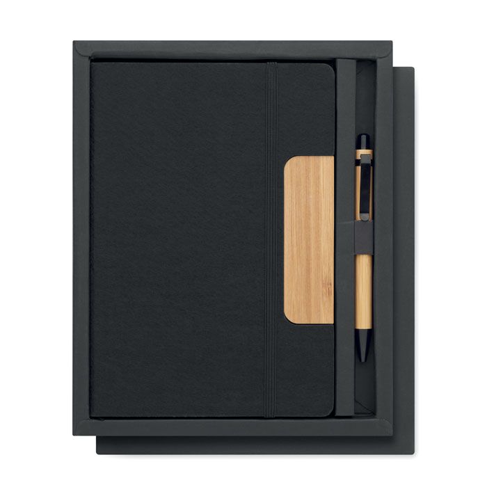 Set de carnets A5 en feutre RPET à couverture rigide avec fonction support de téléphone et stylo à bille en bambou. Reliure cartonnée. 160 pages lignées en papier recyclé (80 feuilles). Fermeture élastique. Marque-page en ruban. Encre bleue.