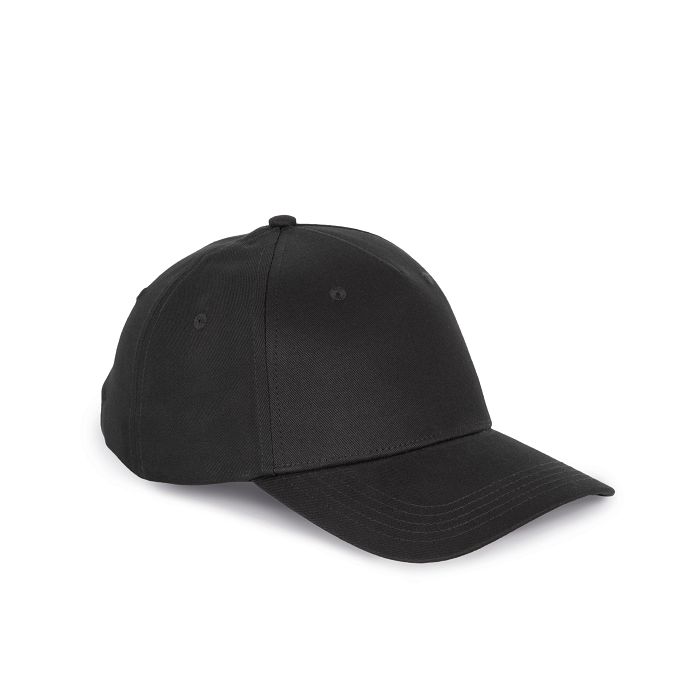 100% coton. Casquette 5 panneaux composée de 60% de coton recyclé pré-consumer et 40% de coton vierge. Boucle d'ajustement en métal située à l'arrière de la casquette.