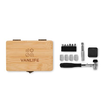 Ensemble d'outils de 13 pièces présenté dans un étui en bambou contenant 6 embouts dans un support avec : 3 embouts (4, 5, 6mm), 2 tailles Philips (PH1, PH2) et 1 adaptateur, 4 douilles (7mm, 8mm, 9mm, 10mm), 1 manche, 1 connecteur et 1 ruban de mesure.