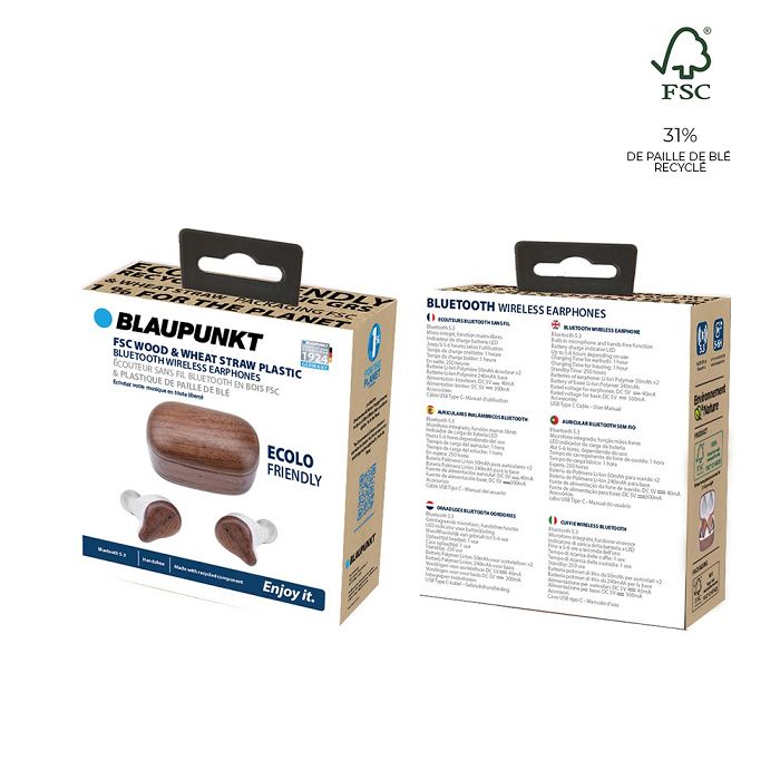 Ces écouteurs Bluetooth 5.3 sont conçus à partir de 24% de bois certifié FSC & de plastique de paille de blé recyclé.