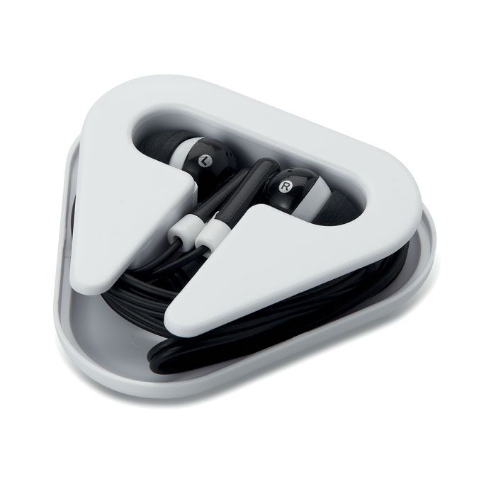 Écouteurs en PVC dans un boîtier triangulaire en PS. Longueur du câble 120 cm.