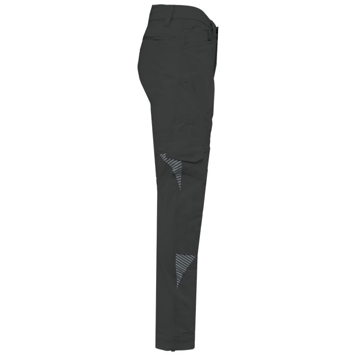 68% polyamide recyclé / 22% coton / 10% élasthanne. Tissu dobby stretch. Lavage 40°C. 2 poches devant. 1 poche ticket sur le côté droit au porté. 1 poche cargo à soufflet fermée par bande auto agrippante + 1 poche plaquée en tissu renforcé sur le côté gauche au porté. 1 poche mètre charpentier volante + 1 poche plaquée compartimentée en tissu renforcé comportant 2 porte-outils sur le côté droit au porté. 2 poches genouillères en Cordura® stretch 92% polyamide, 8% élasthanne ton sur ton (genouillères non fournies) avec bande auto agrippante et rabat intérieur pour maintenir et adapter la genouillère. 2 poches zippées dos. Bas de jambe intérieure renforcé en Cordura® stretch ton sur ton. Details rétro réfléchissants sur le devant et l'arrière de la jambe. Ceinture avec passants dont 1 large et renforcé milieu dos. Taille ajustable à l’intérieur dos à l’aide d’un élastique. Fermeture zippée et bouton plastique dissimulé par tissu renforcé. Triple coutures entrejambe, côtés, et fourche, devant et dos. Ourlet ajustable de 5 cm. Certifications en cours : EPI Classe II. Normes NF EN ISO 13688:2013 + NF EN ISO 13688/A1:2021 (Vêtements de protection - Exigences générales), NF EN 14404-1:2024 + NF EN 14404-3:2024 : Niveau 1U uniquement en combinaison avec les genouillères de protection WKP150 (Équipements de protection individuelle - Protecteurs de genoux pour le travail à genoux). Etiquette de marque détachable.