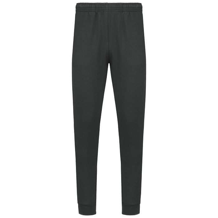 80% coton / 20% polyester. Molleton gratté 2 fils. Coupe droite. 2 poches côtés. Taille élastiquée avec cordon de serrage plat. Bord côtes au bas de jambe.