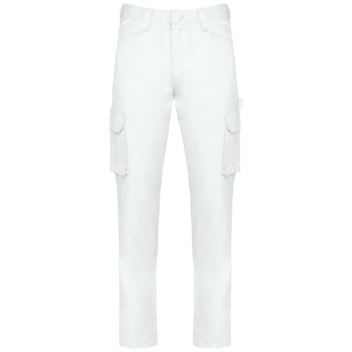 65% coton biologique / 33% polyester recyclé pré-consumer / 2% élasthanne. Tissu sergé. Lavage 60°C. Fermeture zippée et bouton métal caché. Ceinture élastiquée et passants pour plus de confort. Couture de l’entrejambe renforcée par une triple surpiqûre. 2 poches italiennes devant dont 1 avec poche monnaie dans sac de poche droit. 2 poches à soufflet côté et 2 poches arrière avec rabat et fermeture par bande auto-agrippante. Lien d'accrochage outils fixé sur poche arrière gauche. Lien d'accrochage ceinture intérieure. Couture de renfort sur poches pour plus de solidité. Finition double aiguille. Certifié STANDARD 100 by OEKO-TEX®N° CQ1007/8, IFTH.