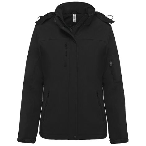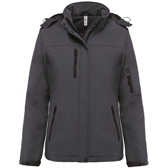 95% polyester / 5% élasthanne. Tissu contrecollé 3 couches respirant 3000 g/m² /24h et imperméable 8000 mm. Extérieur : 95% polyester / 5% élasthanne. Intermédiaire : membrane respirante. Couche intérieure : micropolaire. Doublure matelassée 100% polyester. Devant : 4 poches zippées (2 latérales, 1 sur la manche, 1 poitrine côté droit). 2 poches intérieures avec bouton pression. Capuche amovible 3 panneaux doublée et matelassée, réglable avec stoppeurs. Bas de manche réglable avec bande auto-agrippante. 1 zip côté cœur et 1 zip au bas du vêtement pour accès personnalisation. Certifié STANDARD 100 by OEKO-TEX® N° CQ 1007/8, IFTH.