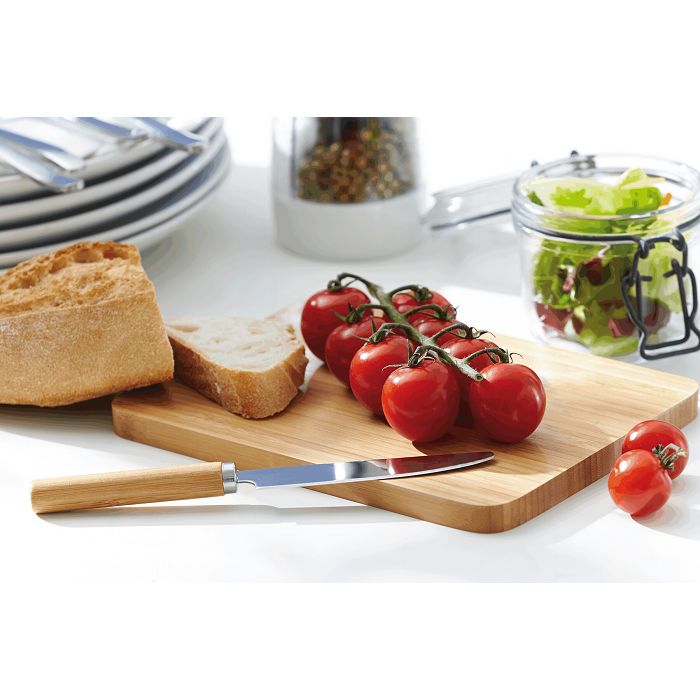Planche à découper MINI BAMBOO: planche en bambou, couteau avec lame en acier inoxydable et manche en bambou, insert de papier pour le couteau