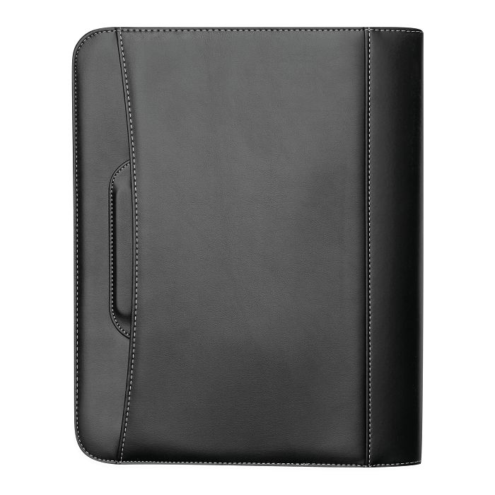 Porte-documents NOBLESSE RING format DIN-A4 en simili-cuir de qualité: Avec fermeture éclair, classeur 4 anneaux, calculatrice, bloc d´écriture, passant pour un stylo, poches diverses, poignée pliable, coutures blanches, plaque métal pour gravure.