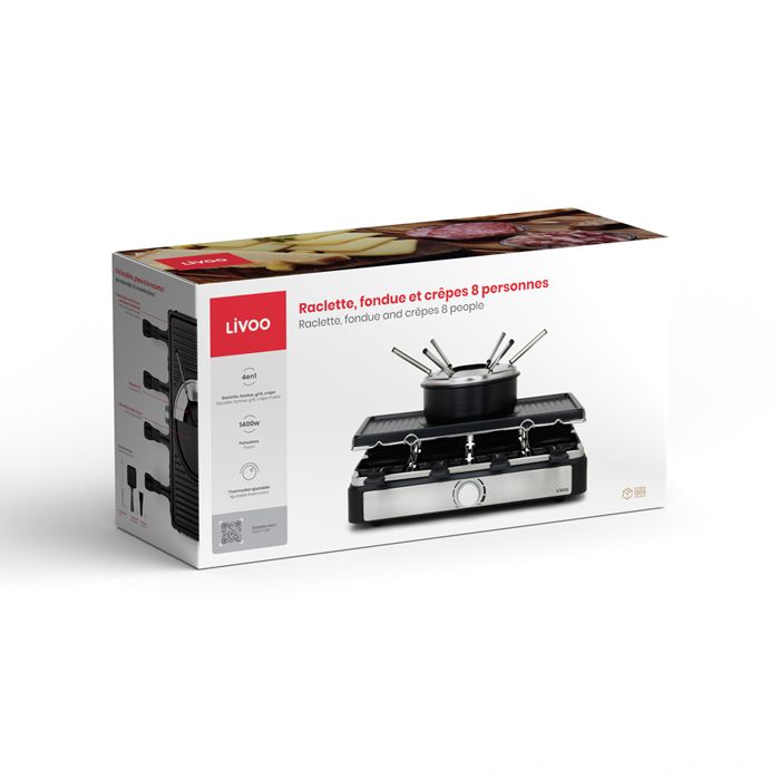 • 1 caquelon 1,6 L avec collerette antiéclaboussures, 6 fourchettes, 8 spatules et 8 caquelons avec revêtement antiadhésif