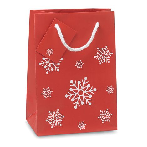 Elégant sac cadeau en papier décoré de motifs de flocons de neige. Petite carte message incluse. Petit modèle.