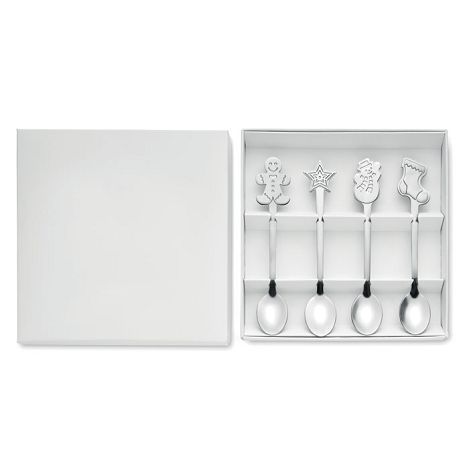 Set de 4 cuillères à thé en acier inoxydable avec motif de Noël. Présenté dans une boîte cadeau. Le bois est un produit naturel, et présente de légères variations de couleur, de décoration et de tailles.