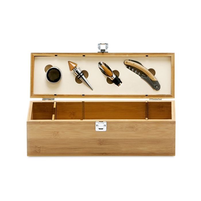 Set à vin en bambou et zinc. Cet ensemble comprend un tire-bouchon avec couteau de sommelier, un collier anti-gouttes, un verseur anti-gouttes avec bouchon et un bouchon.363 x 112 x 119 mm