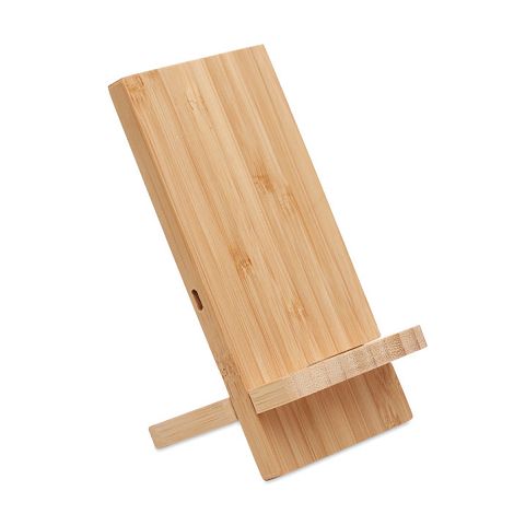 Support et chargeur sans fil à double bobine en bambou. Il comprend 2 pièces, assemblage requis. Sortie : DC 9V/1.1A (10W) pour une charge rapide. Compatible avec les derniers Androïdes, iPhone® 8, X et plus récents.
