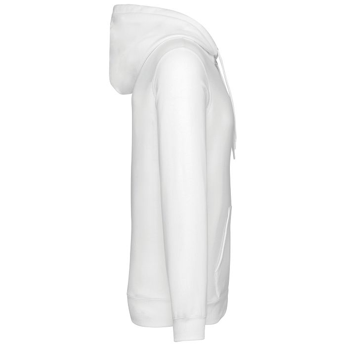 50% coton ring-spun / 50% polyester recyclé post consumer. Molleton gratté. Coupe straight. Coupé cousu. Bord-côte 2x1 montage tubulaire pour une meilleure finition au col, bas de manches et de vêtement. Poche kangourou. Capuche doublée polycoton jersey avec cordon de serrage plat. Bande de propreté jersey ton sur ton intérieur col. Pas d'étiquette de marque au col, uniquement une puce de taille pour faciliter la personnalisation.