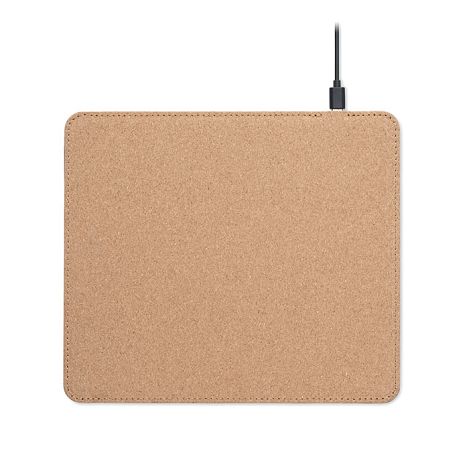Tapis de souris en liège avec chargeur sans fil 10W. Sortie : DC9V/1.1A. Compatible avec les derniers Androïdes, iPhone® 8 et plusrécents. Taille 23cm x20cm.
