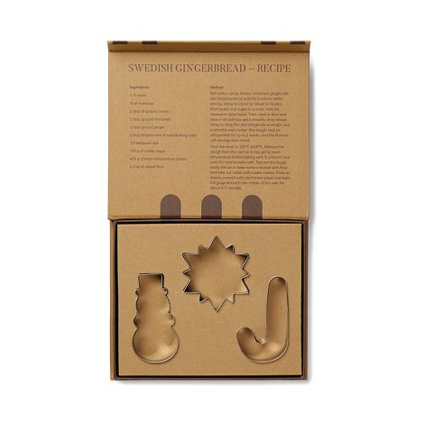 Ensemble de 3 emporte-pièces en acier inoxydable. L'ensemble comprend trois formes différentes. Ces couteaux durables sont faciles à nettoyer. Livré dans une boîte cadeau, avec une recette suédoise de biscuits au gingembre imprimée sur le couvercle intérieur.