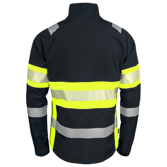 Softshell coupe vent / imperméable - Stretch HV - Très confortable - Coutures thermo soudées - Zip central YKK® étanche sous rabat + protège menton - Poches latérales zippées - Bandes HV segmentées + épaules nouvelles génération pour plus de souplesse - Poignets réglables a/ Velcro - Passe-pouce - HV EN ISO 20471 Classe 1