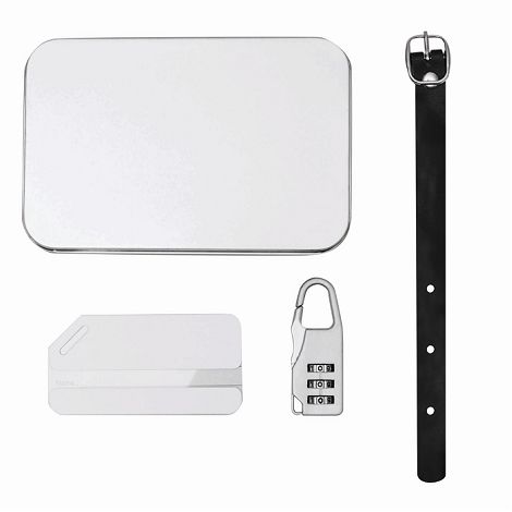 Accessoires de voyage FAR AWAY: composé d´une carte en aluminium avec etiquette modulable pour l´adresse, d´un cadenas à chiffres avec mousqueton et d´une sangle