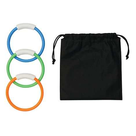 Anneaux de plongée SPLASH LOOPS, 3 pièces : composés de 1 anneau bleu, 1 orange et 1 vert, la partie blanche de l’anneau se remplit d’eau, en raison du poids inégalement réparti, les anneaux se tiennent verticalement sur le fond de la piscine et peuvent être facilement saisis, dans un sac avec cordon