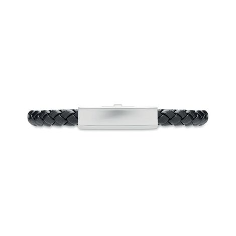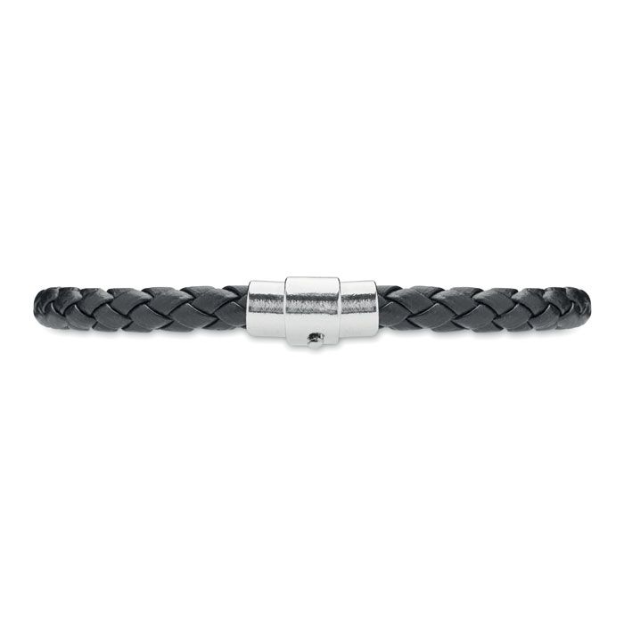 Bracelet en simili-cuir tressé, avec des accessoires en acier poli. Fermoir à pression. Tour de poignet : 18 cm.