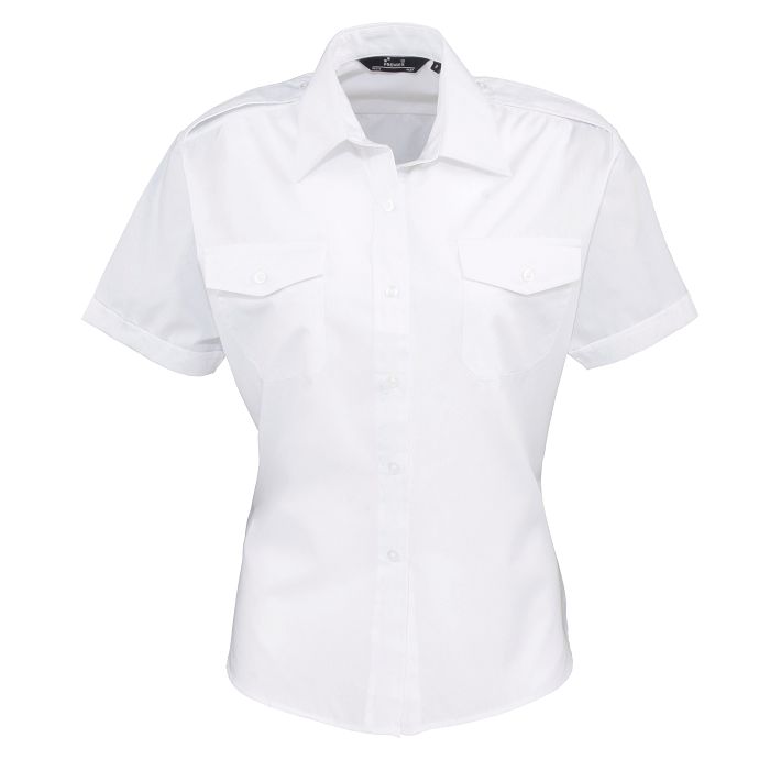 65% polyester, 35% coton, popeline simple. Manches courtes. 2 poches avant à rabat, boutonnées. Emplacement stylo sur côté gauche. Patte d'accrochage pour galons (galons non fournis). Entretien facile.