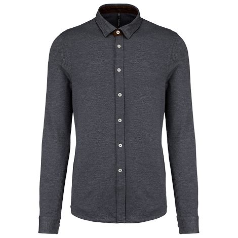 68% coton / 32% polyester. Maille jacquard. Pied de col en suédine contrasté. Look moderne. Matière confortable et douce. Patte de boutonnage classique avec boutons imitation nacre. Poignets réglables avec boutons imitation nacre. Bas arrondi.