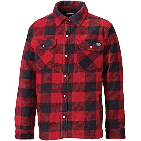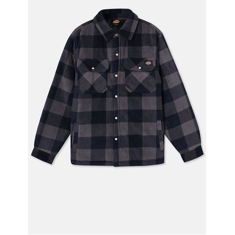Surchemise polaire 100% polyester 220 g/m², doublée 100% polyester (50 g/m²) et matelassée 100% polyester (rembourrage 120 g/m²). Fermeture par boutons-pression. 2 poches latérales et 2 poches poitrine avec rabat à fermeture par bouton-pression. Étiquette Dickies cousue sur la poche poitrine gauche.