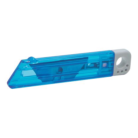 Cutter SLIDE IT: bouton poussoir avec ressort de rappel, lame interchangeable, coque plastique colorée avec oeillet pour accrocher.