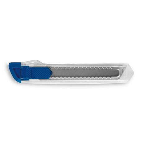 Cutter avec mécanisme de verrouillage pour la sécurité et dessus amovible pour le réglage de la lame. Cutter avec corps transparent.155 x 30 x 10 mm