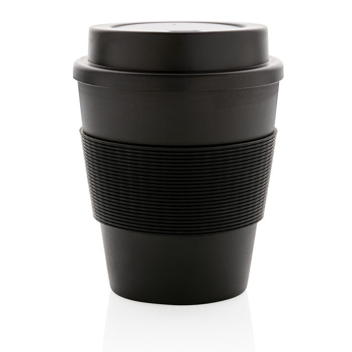 Mug 350ml en PP recyclable, couvercle à vis et bandeau de protection en silicone. Convient pour les boissons froides et les boissons chaudes jusqu'à 100 degrés. Passe au lave-vaisselle et au micro-ondes.