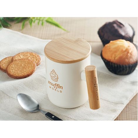 Mug en porcelaine avec couvercle et poignée en bambou. Capacité : 380 ml.
