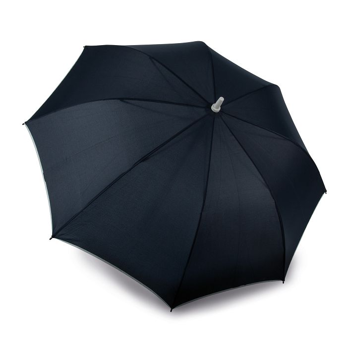 100 % polyester. Grand parapluie, type golf, (diamètre : 118 cm), à ouverture automatique. Il se compose d'un mat en métal de 14 mm, de baleines en fibres de verre, de pointes et embouts de baleine en polycarbonate colorés. La toile est en pongé de polyester. Bord des panneaux, poignée et tige en couleur contrastée.