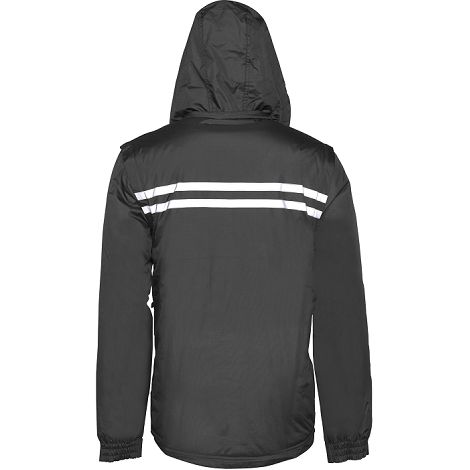 100 % polyester. Extérieur : 100% polyester ripstop. Enduction PVC. Intérieur : entièrement ouatiné, doublure dos et intérieur col en polaire. Fermeture zippée et patte de boutonnage pression. Manches amovibles. 5 poches fonctionnelles devant dont une à badge transparente. 1 poche intérieure. Bandes réfléchissantes dos et sur poche poitrine. Bandes de renfort épaules. Ouverture d'aisance zippée au bas de vêtement. Taille ajustable par un cordon intérieur. Capuche dans le col. Zip pour personnalisation bas et poitrine.