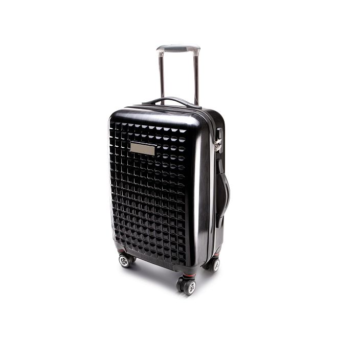 Valise trolley taille cabine en polycarbonate très haute qualité, 4 roues doubles, design exclusif, divers rangements à l'intérieur, fermeture sur le côté cadenassée. Possibilité de personnalisation sur plaque en métal amovible.